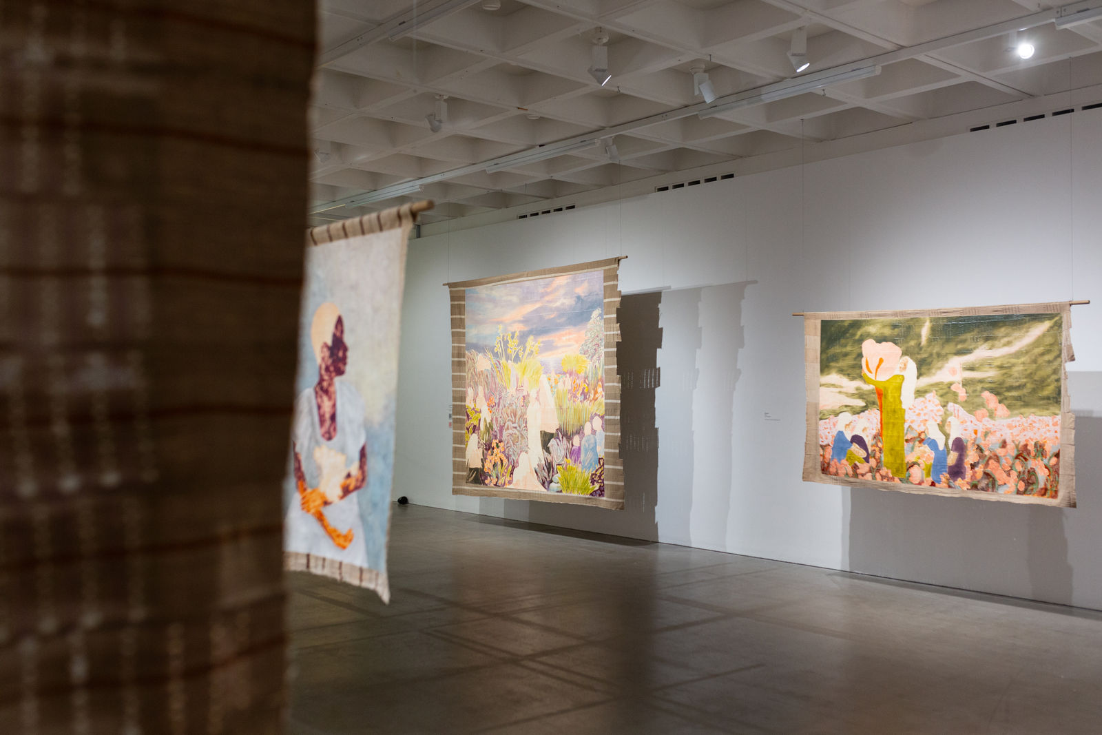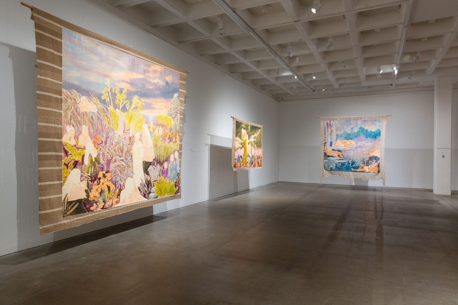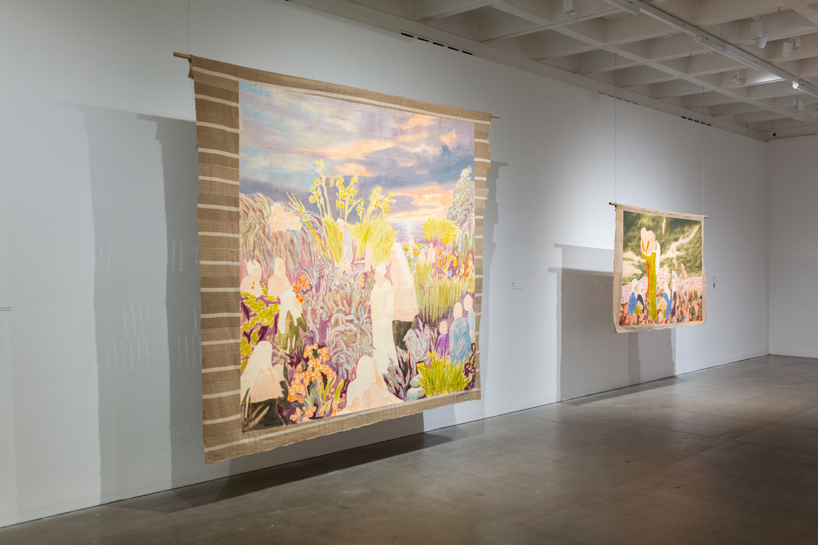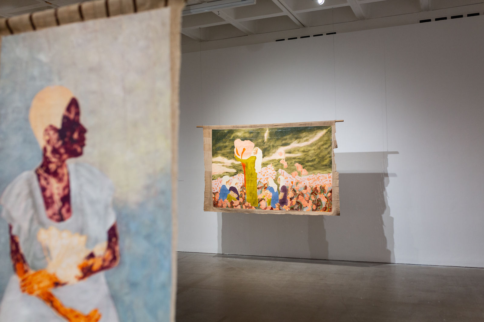 Hung away from the gallery wall or suspended from ceilings, Omuku invites the audience to see both sides of each cloth, revealing symbolic artistry and patterns like prayers of fertility woven within. Her paradisical landscapes and gardens draw inspiration from real places like Monet’s Garden in Giverny and the International Institute of Tropical Agriculture in Ibadan, as well as memories of her mother’s garden and imagined realms where flora and fauna take on fantastical forms.