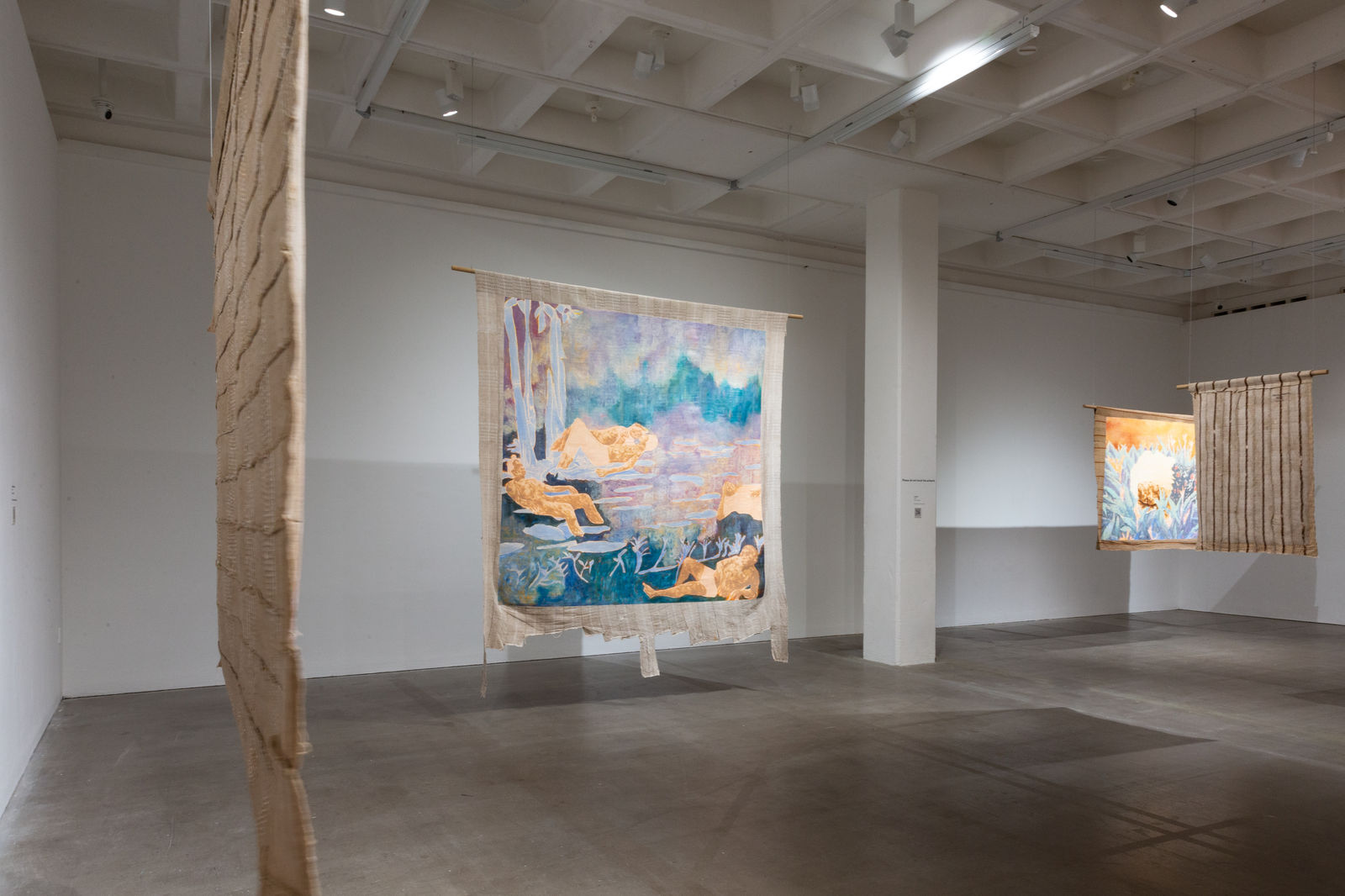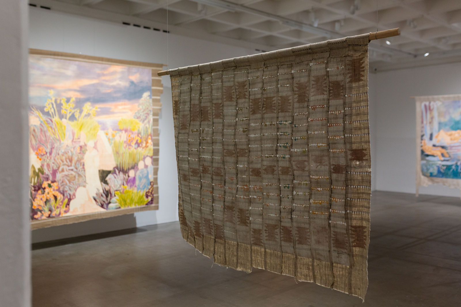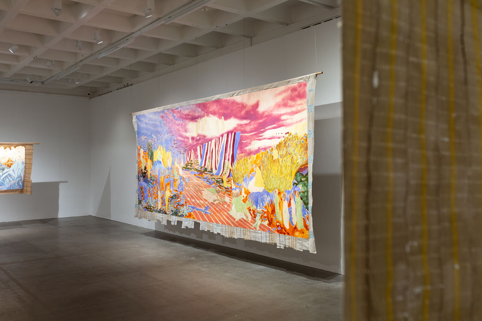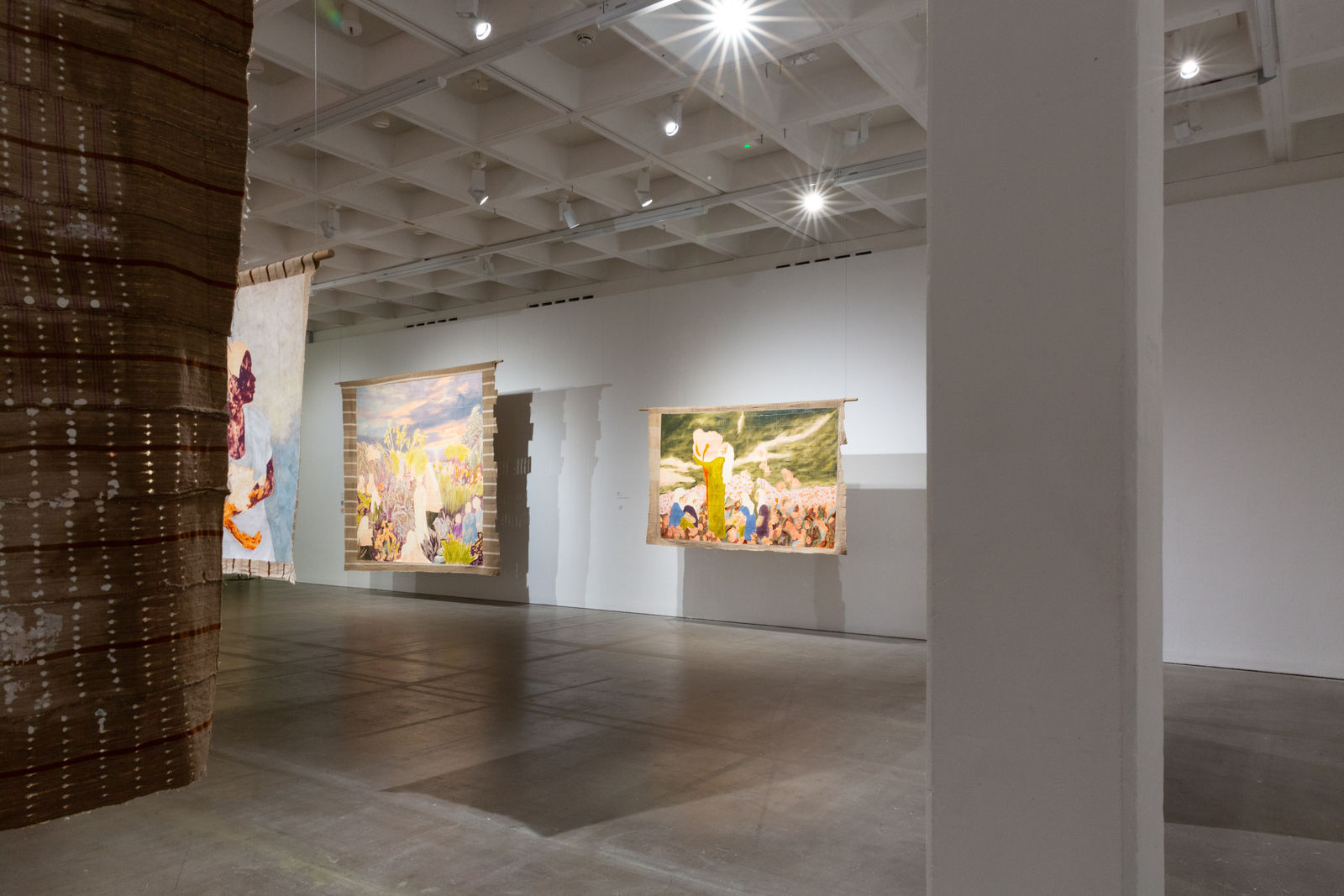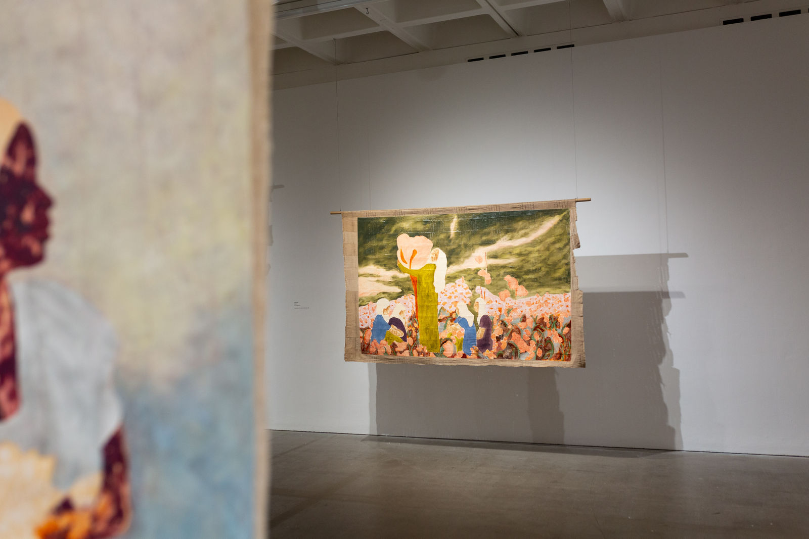 Hung away from the gallery wall or suspended from ceilings, Omuku invites the audience to see both sides of each cloth, revealing symbolic artistry and patterns like prayers of fertility woven within. Her paradisical landscapes and gardens draw inspiration from real places like Monet’s Garden in Giverny and the International Institute of Tropical Agriculture in Ibadan, as well as memories of her mother’s garden and imagined realms where flora and fauna take on fantastical forms.