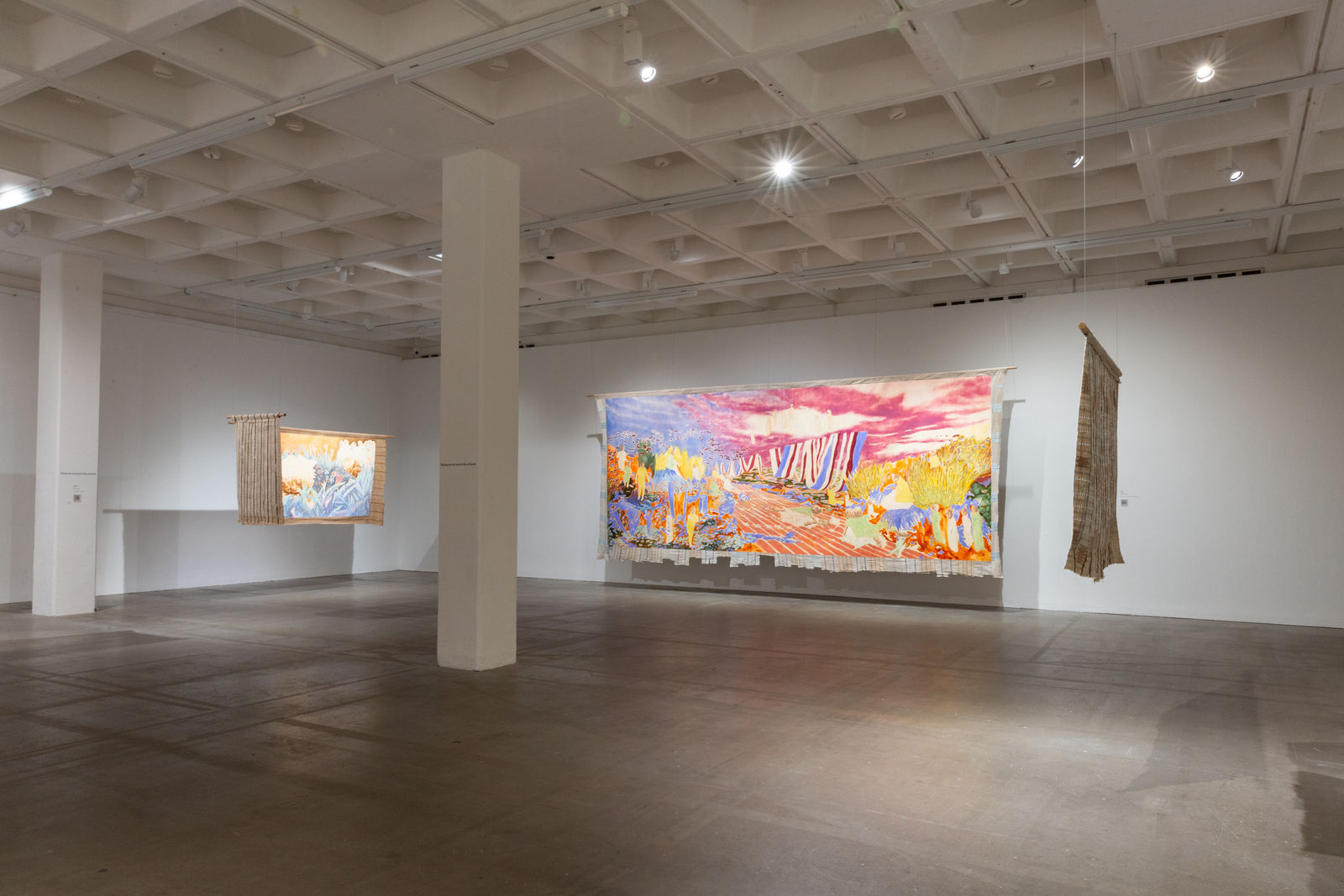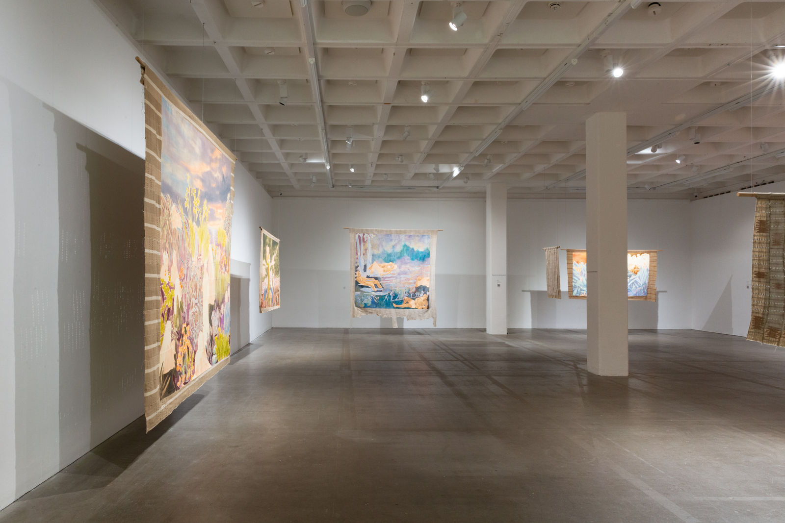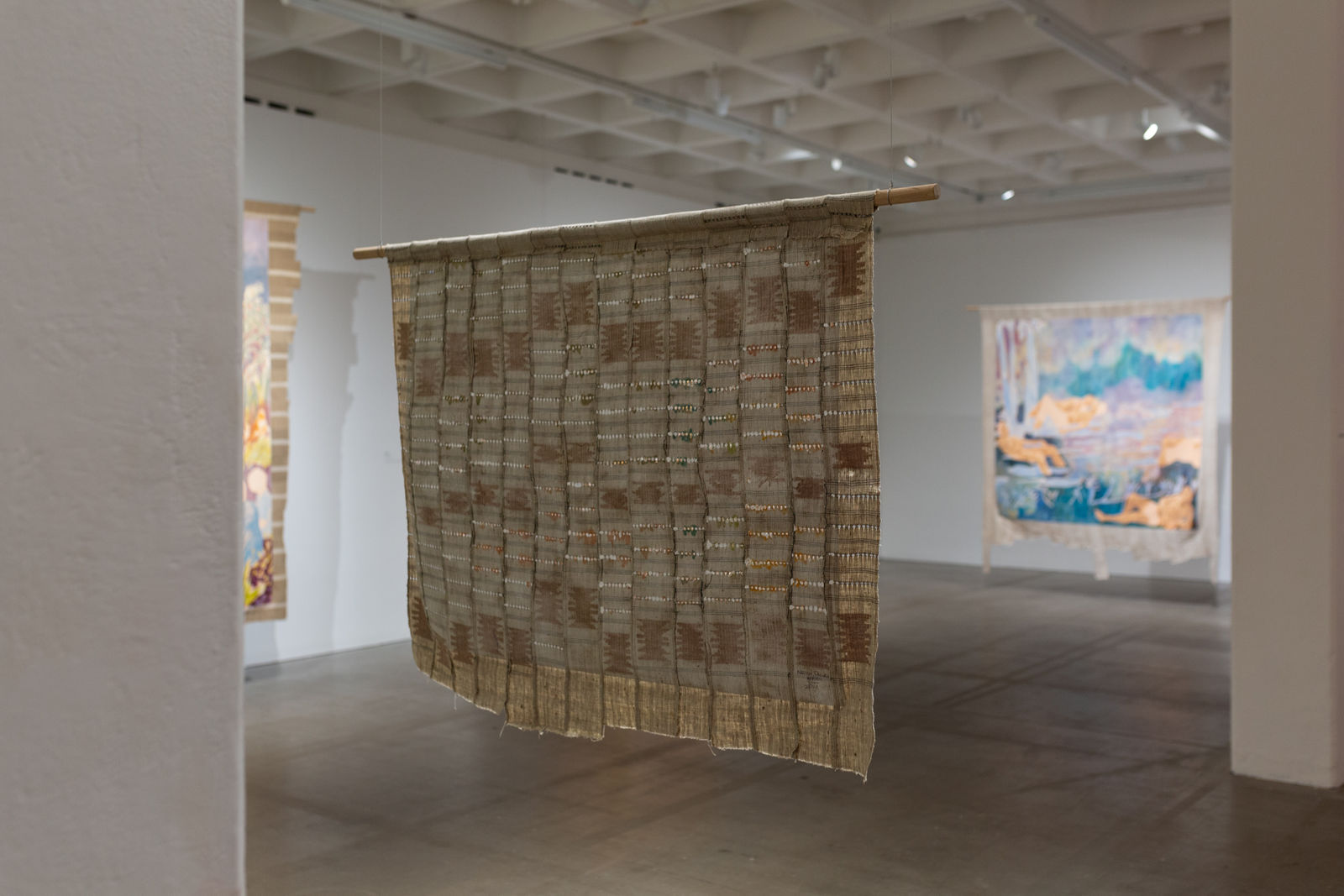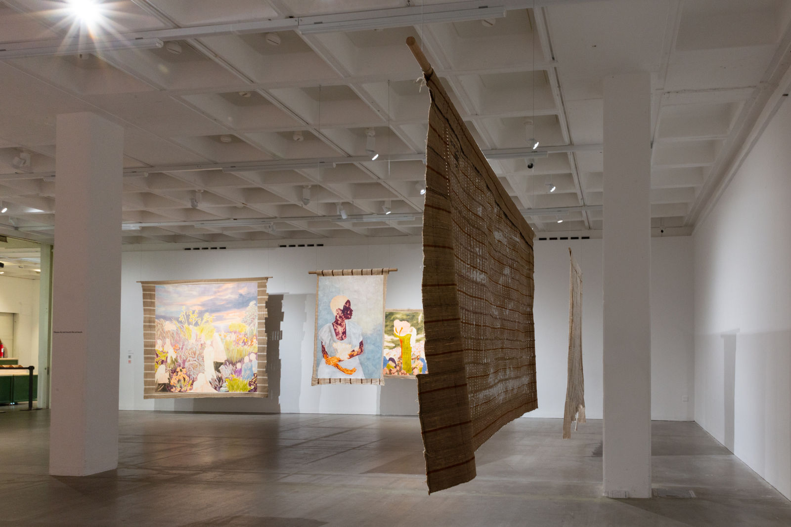 Hung away from the gallery wall or suspended from ceilings, Omuku invites the audience to see both sides of each cloth, revealing symbolic artistry and patterns like prayers of fertility woven within. Her paradisical landscapes and gardens draw inspiration from real places like Monet’s Garden in Giverny and the International Institute of Tropical Agriculture in Ibadan, as well as memories of her mother’s garden and imagined realms where flora and fauna take on fantastical forms.