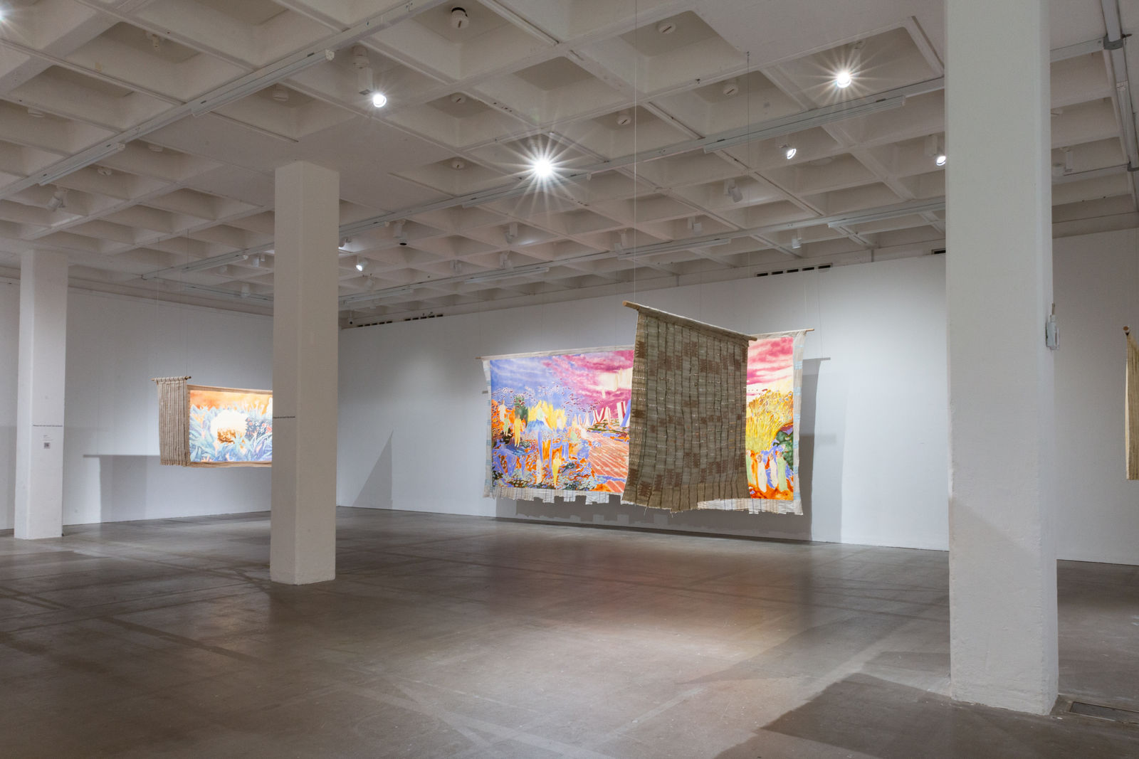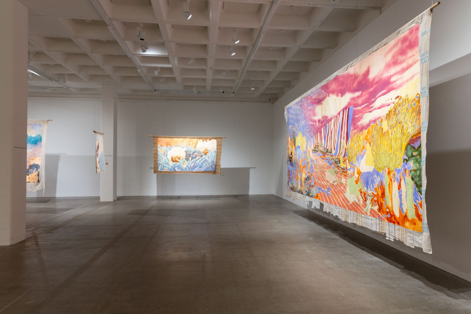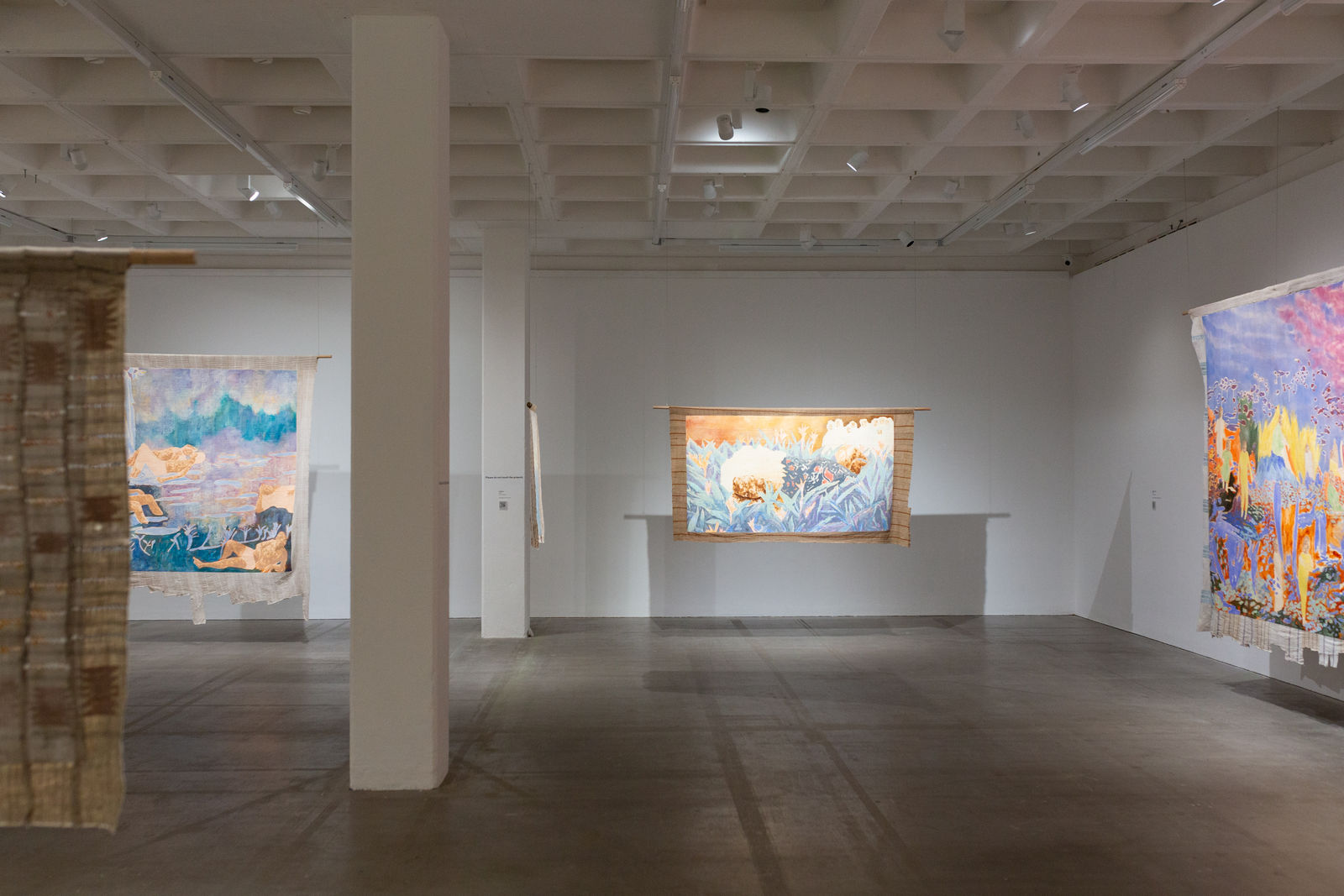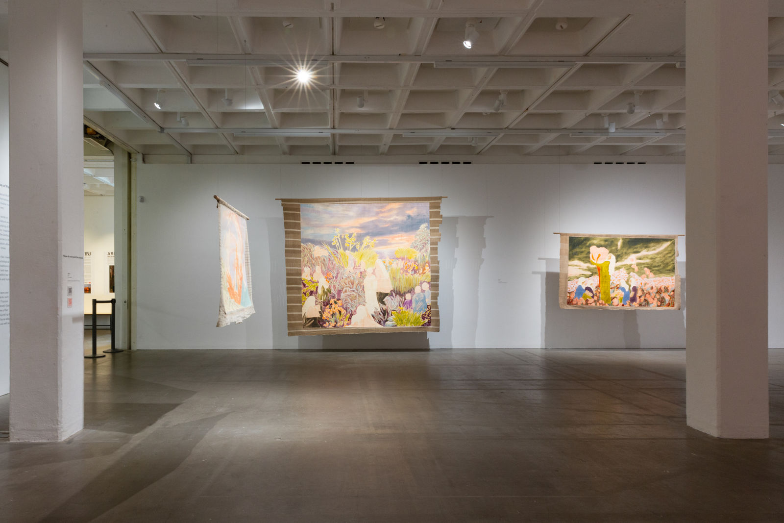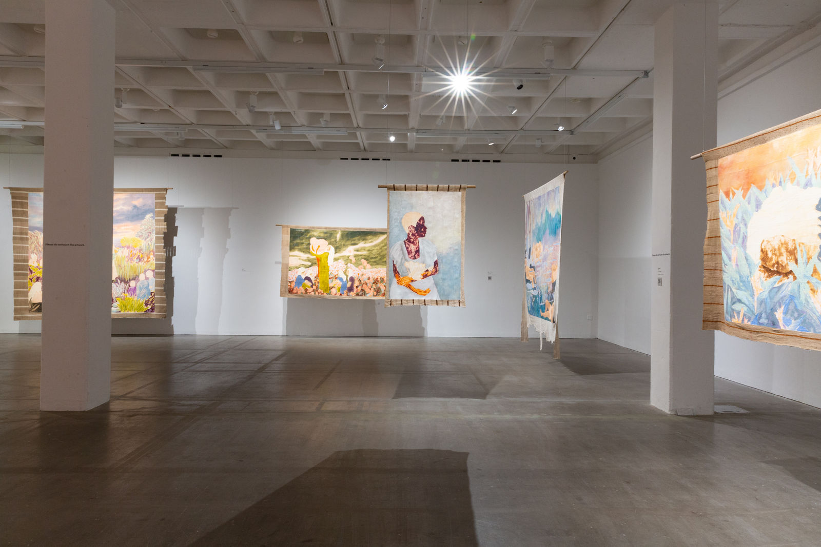 Hung away from the gallery wall or suspended from ceilings, Omuku invites the audience to see both sides of each cloth, revealing symbolic artistry and patterns like prayers of fertility woven within. Her paradisical landscapes and gardens draw inspiration from real places like Monet’s Garden in Giverny and the International Institute of Tropical Agriculture in Ibadan, as well as memories of her mother’s garden and imagined realms where flora and fauna take on fantastical forms.