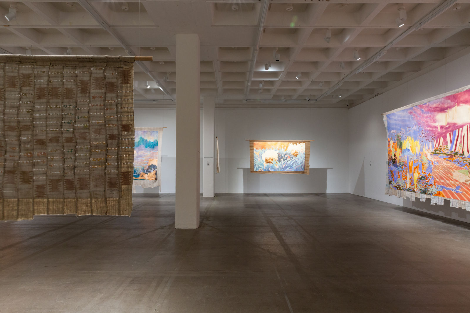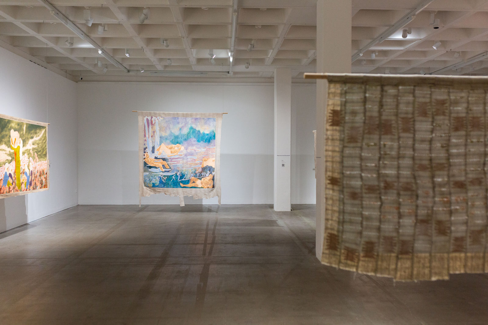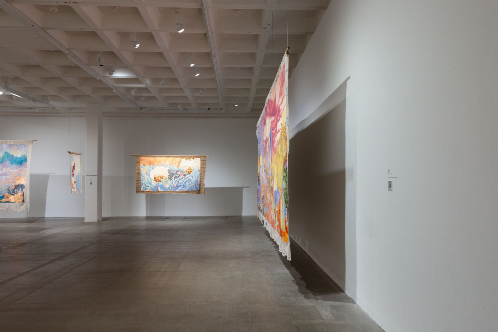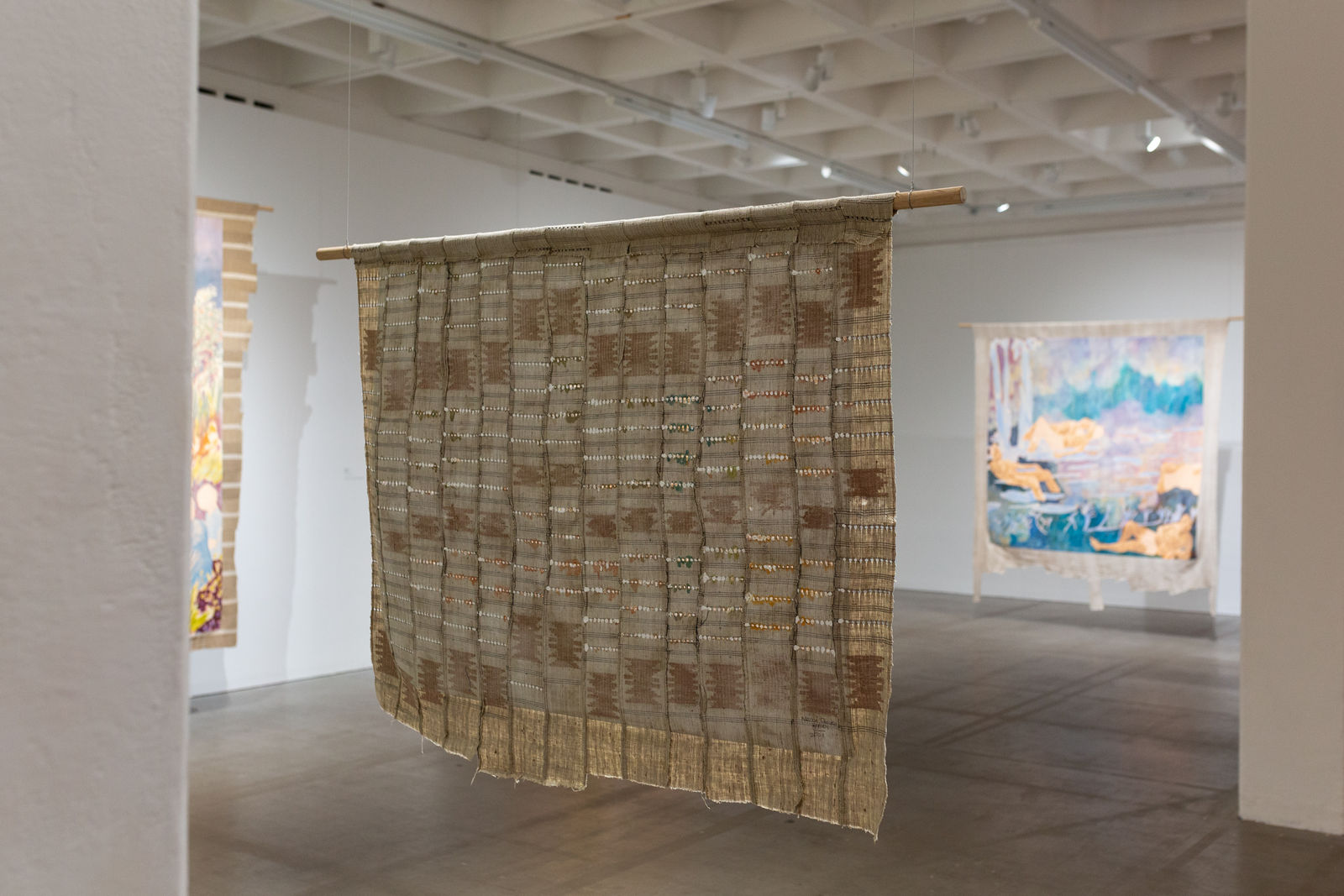 Hung away from the gallery wall or suspended from ceilings, Omuku invites the audience to see both sides of each cloth, revealing symbolic artistry and patterns like prayers of fertility woven within. Her paradisical landscapes and gardens draw inspiration from real places like Monet’s Garden in Giverny and the International Institute of Tropical Agriculture in Ibadan, as well as memories of her mother’s garden and imagined realms where flora and fauna take on fantastical forms.