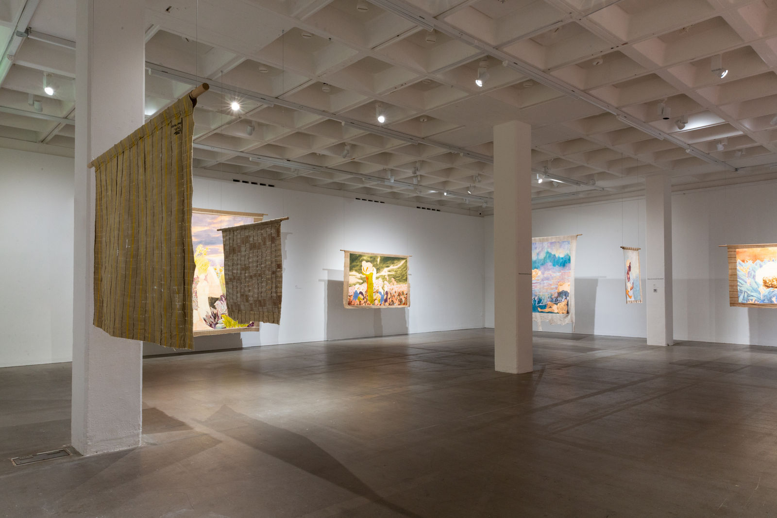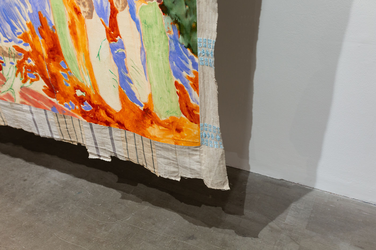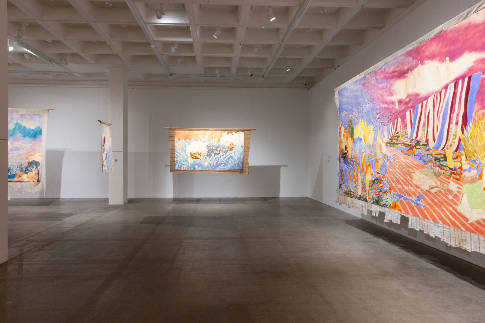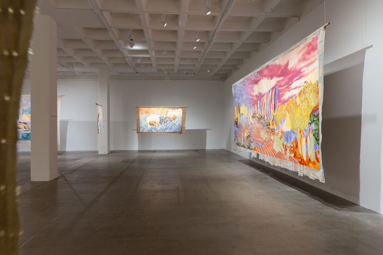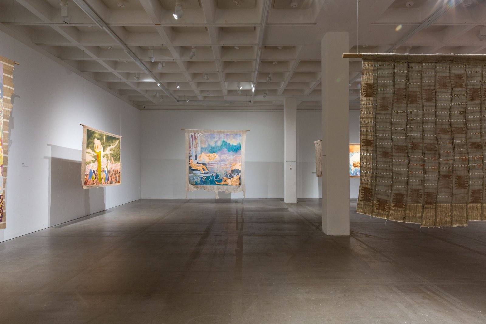 Hung away from the gallery wall or suspended from ceilings, Omuku invites the audience to see both sides of each cloth, revealing symbolic artistry and patterns like prayers of fertility woven within. Her paradisical landscapes and gardens draw inspiration from real places like Monet’s Garden in Giverny and the International Institute of Tropical Agriculture in Ibadan, as well as memories of her mother’s garden and imagined realms where flora and fauna take on fantastical forms.