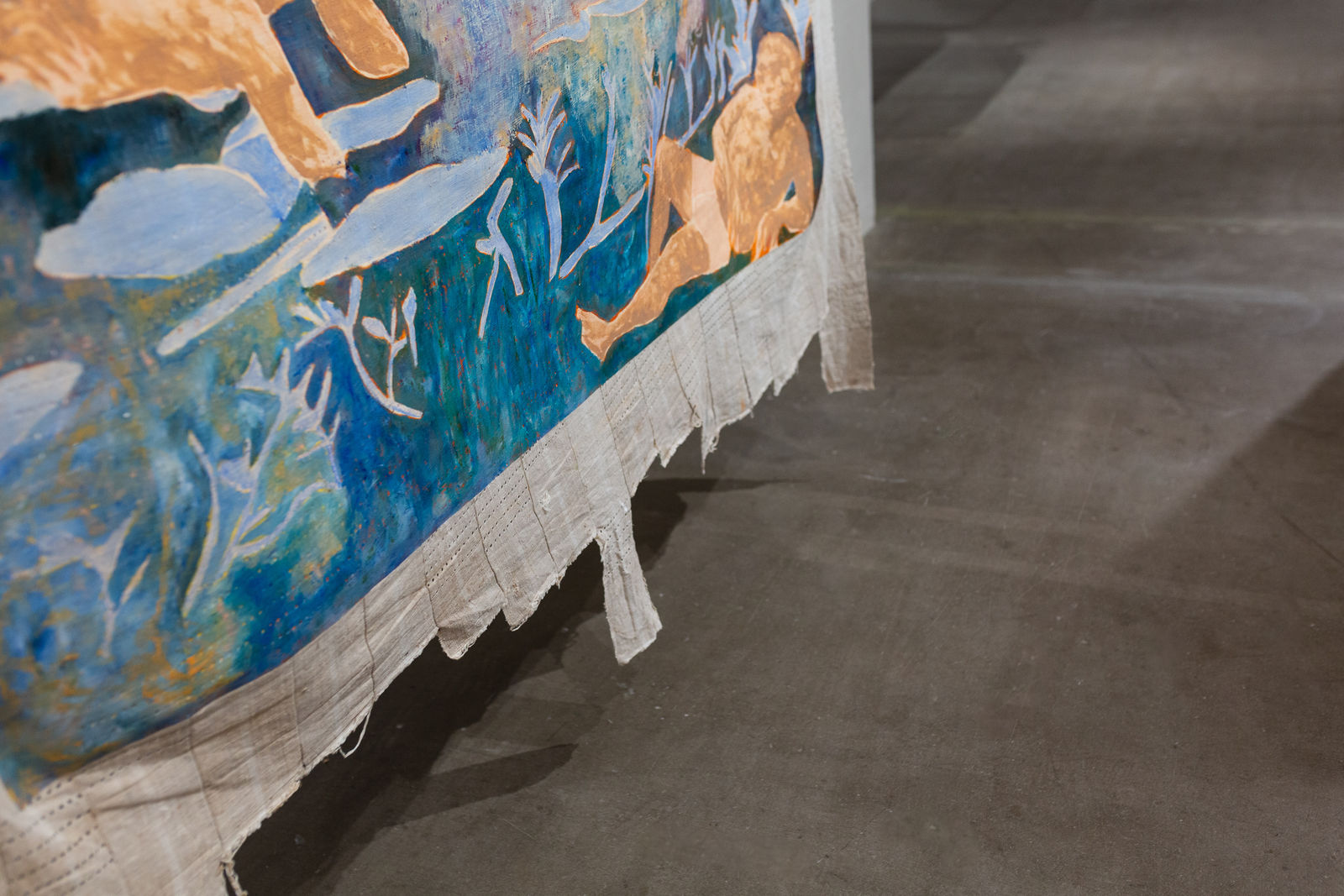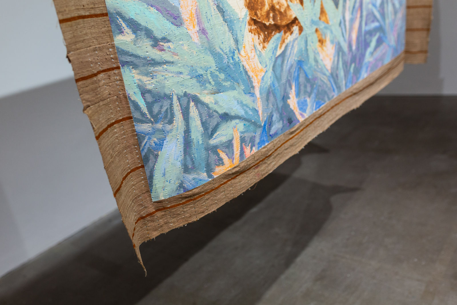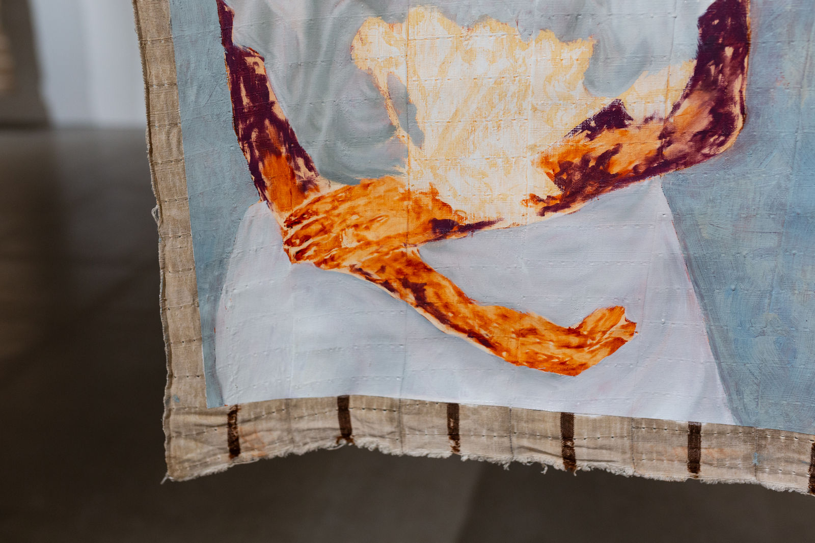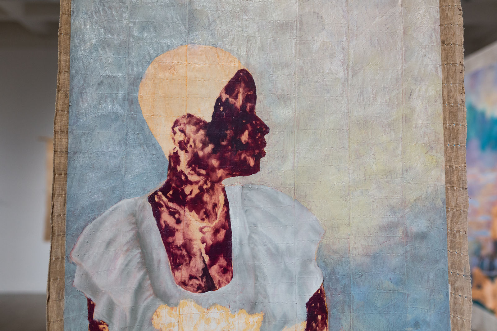 Omuku’s rich, dreamlike color palette is heavily influenced by the muted tones of Sanyan, a pre-colonial Nigerian textile woven from moth silk and cotton, blending Western oil painting traditions with Nigeria’s textile craftsmanship.